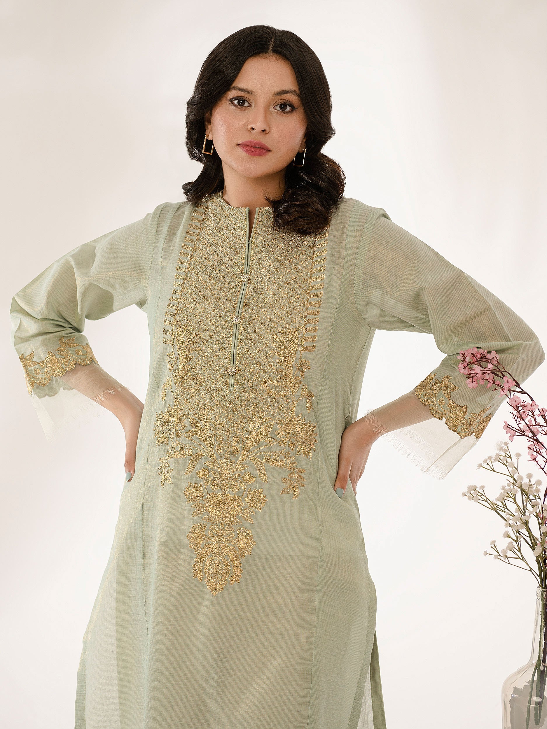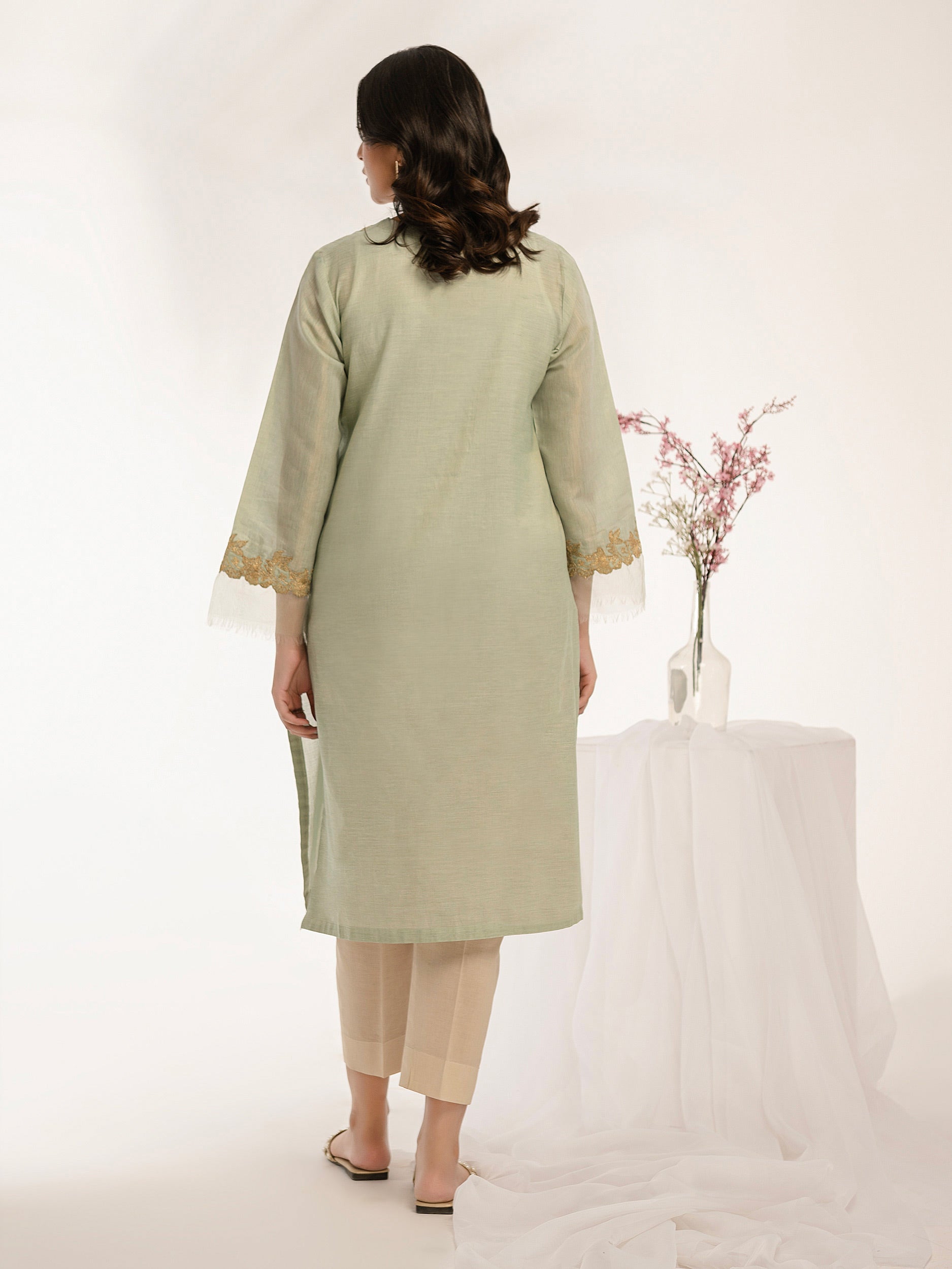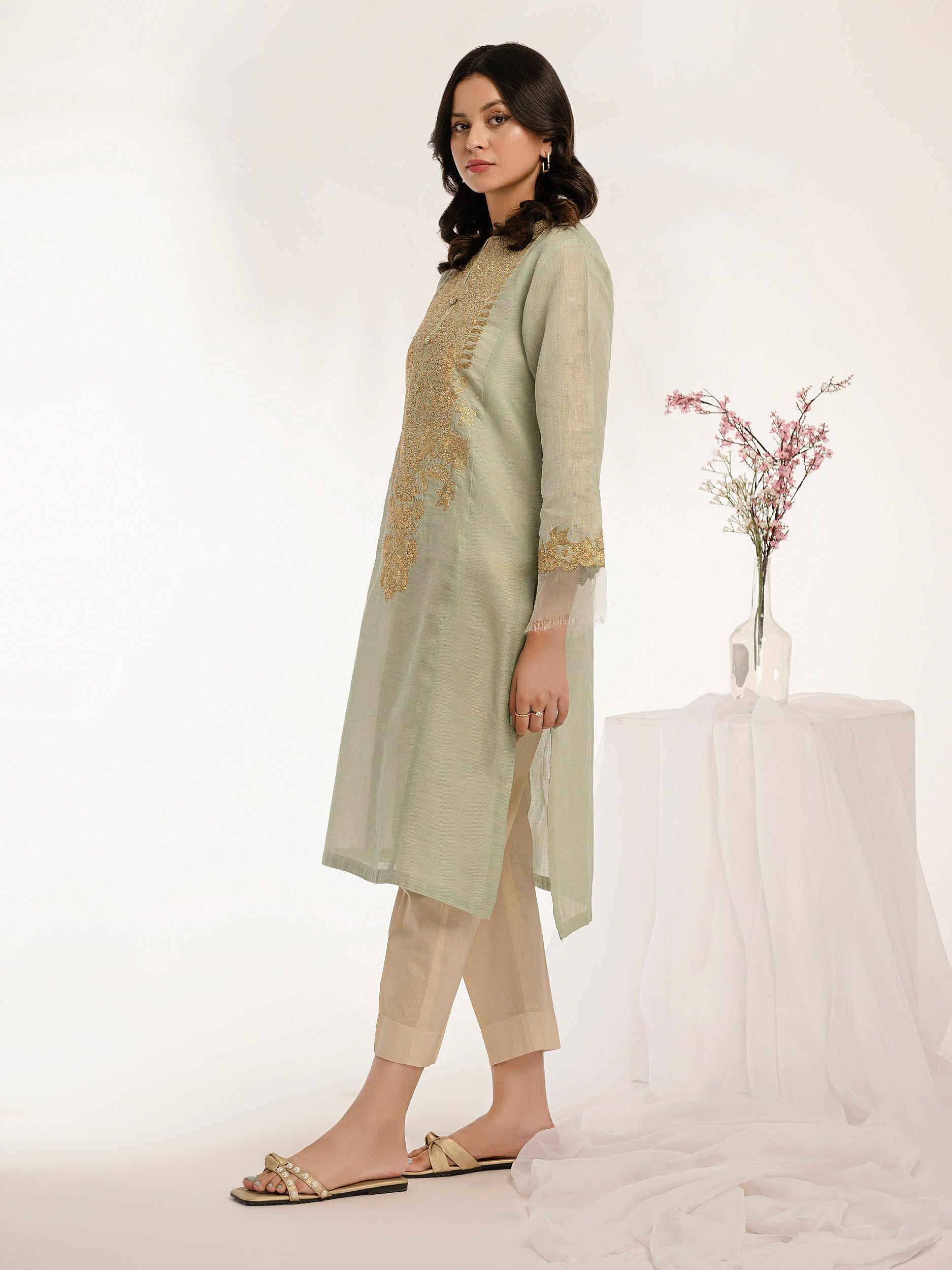 - Dyed panelled shirt with embroidery and rhinestone embellished buttons on the placket