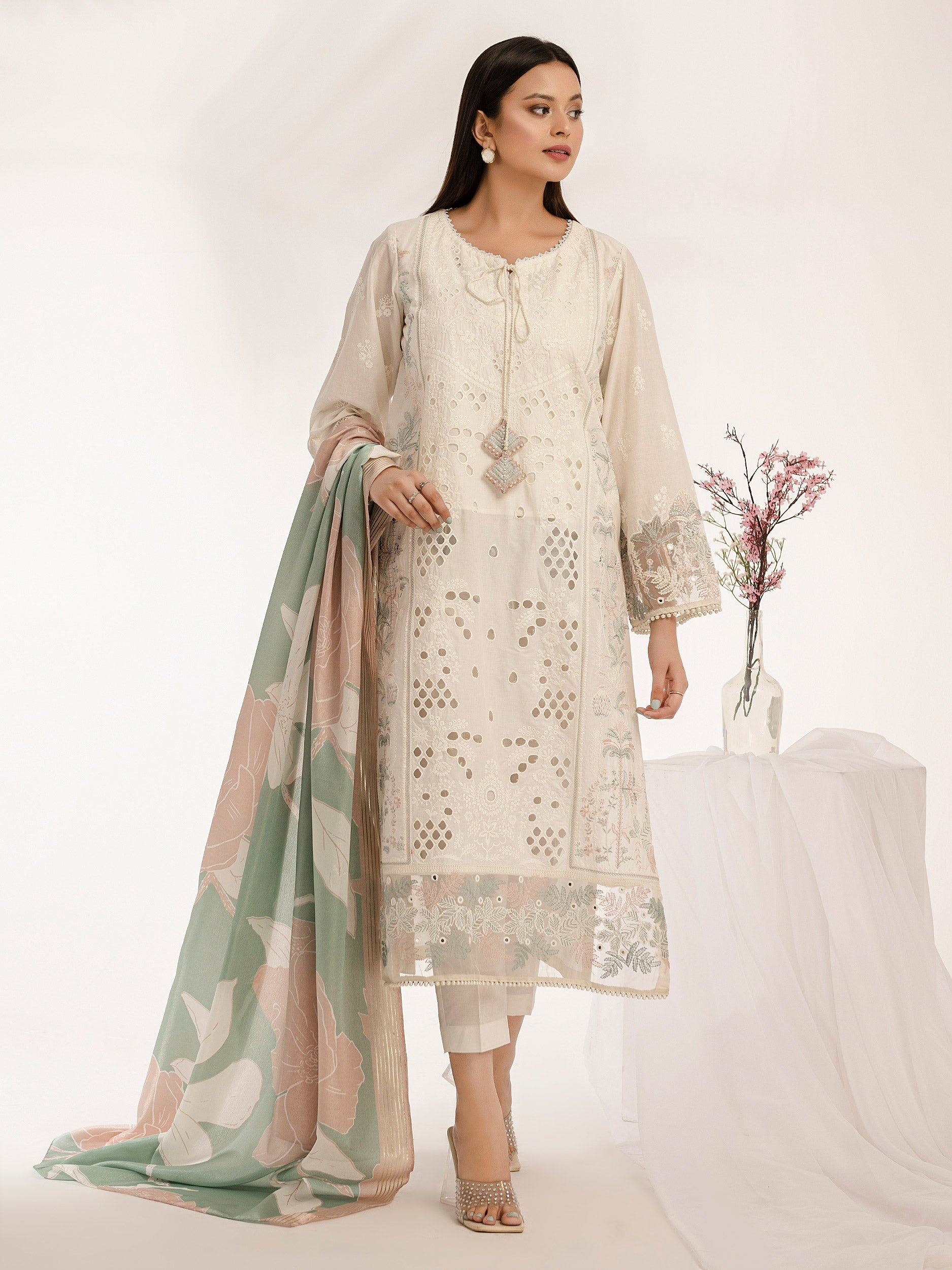 - Dyed schiffli shirt with sequins embroidery & lace detailing on the neckline and cuffs