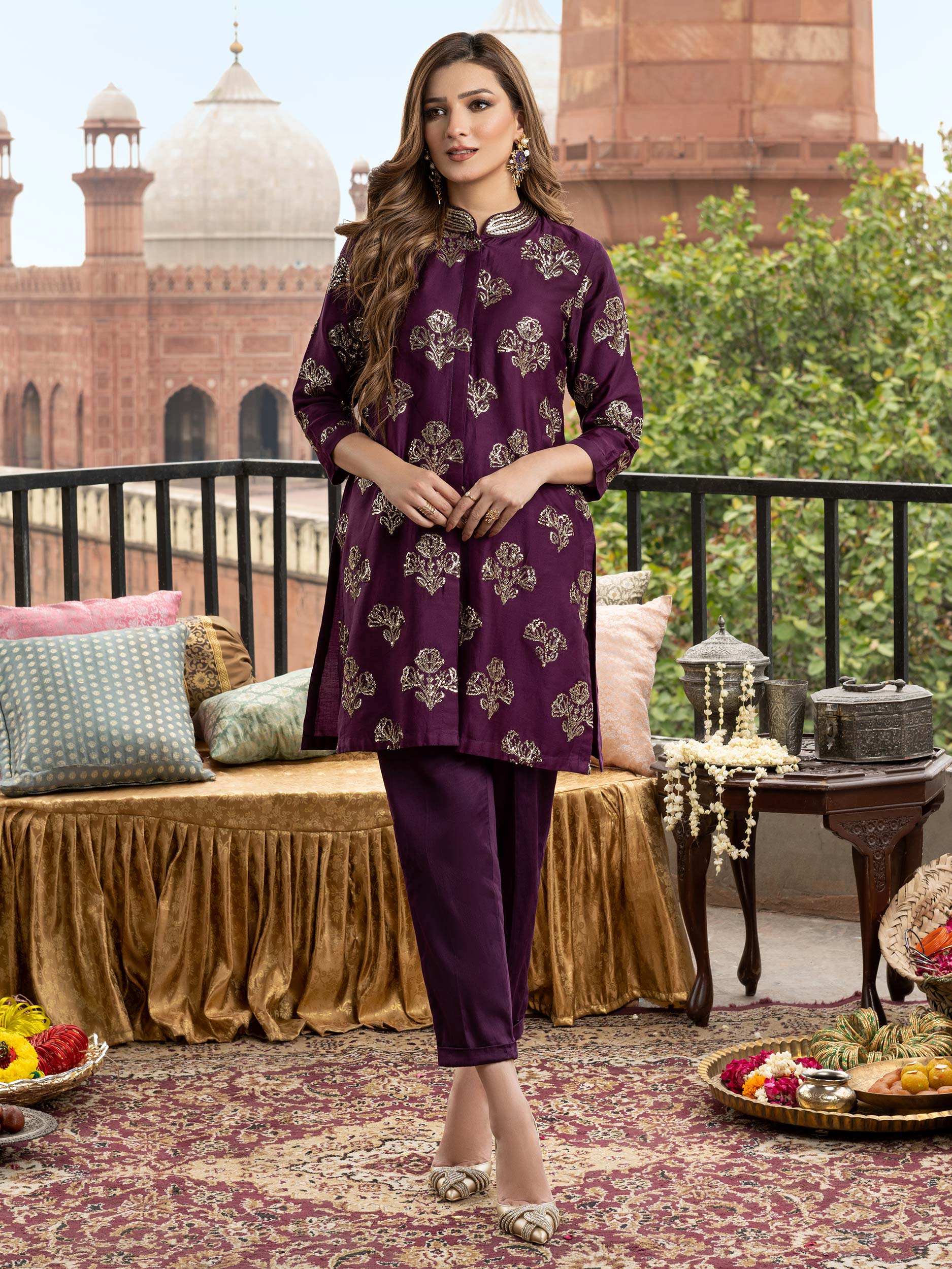 - Dyed jacket style front slit shirt with sequins embroidery